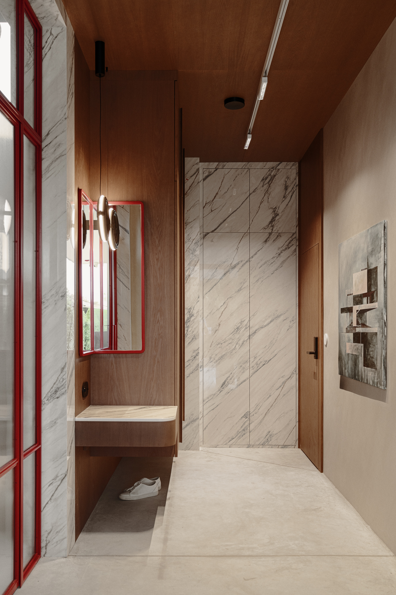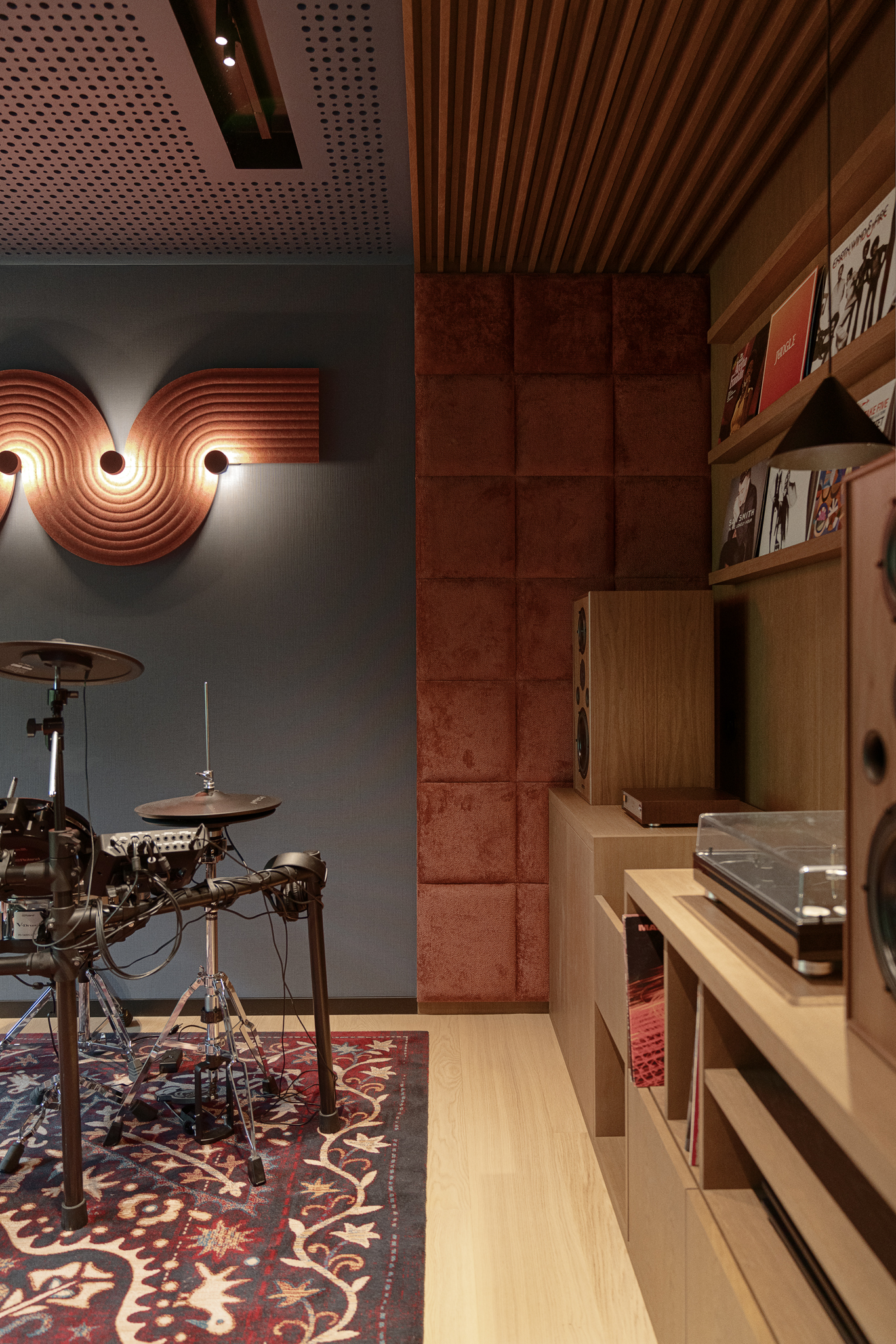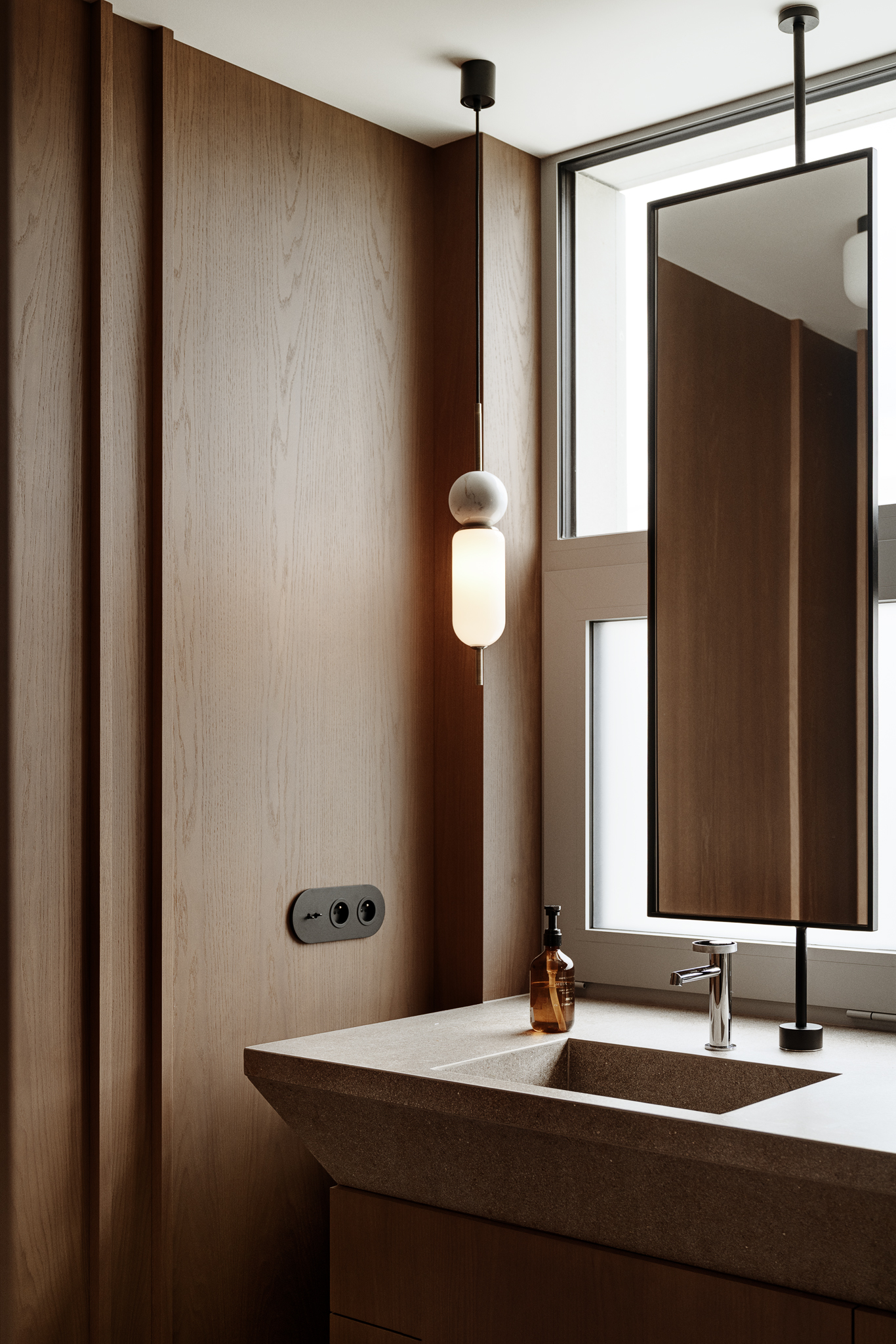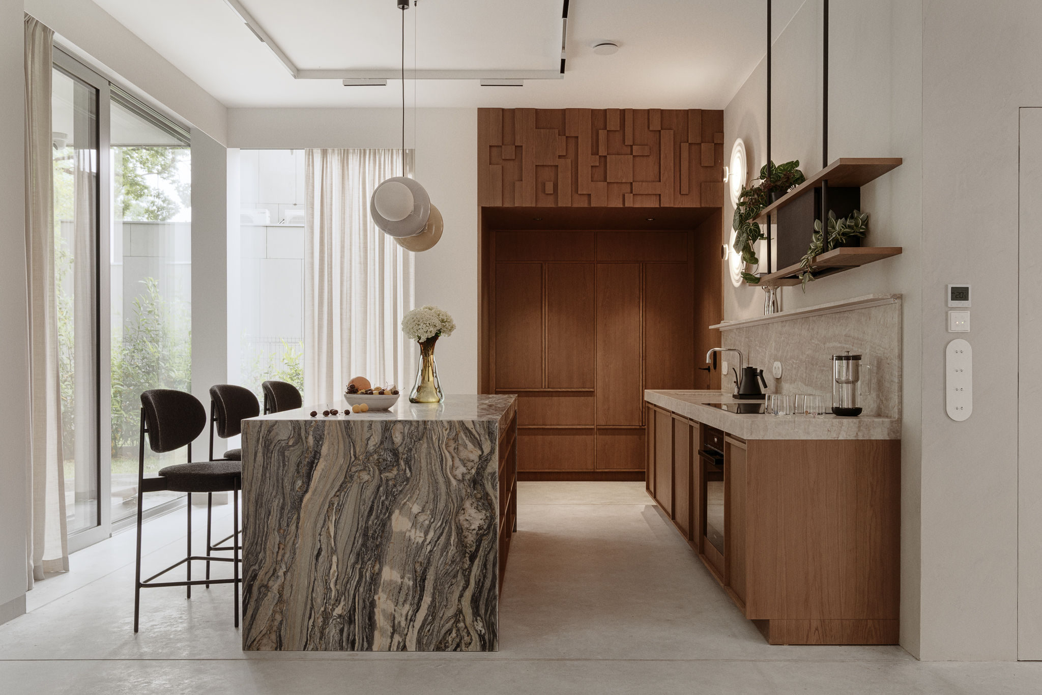 W projekcie dominują naturalne materiały: drewno, kamień i beton. Odważne akcenty kolorystyczne przełamują stonowaną paletę, nadając wnętrzu wyrazisty charakter.