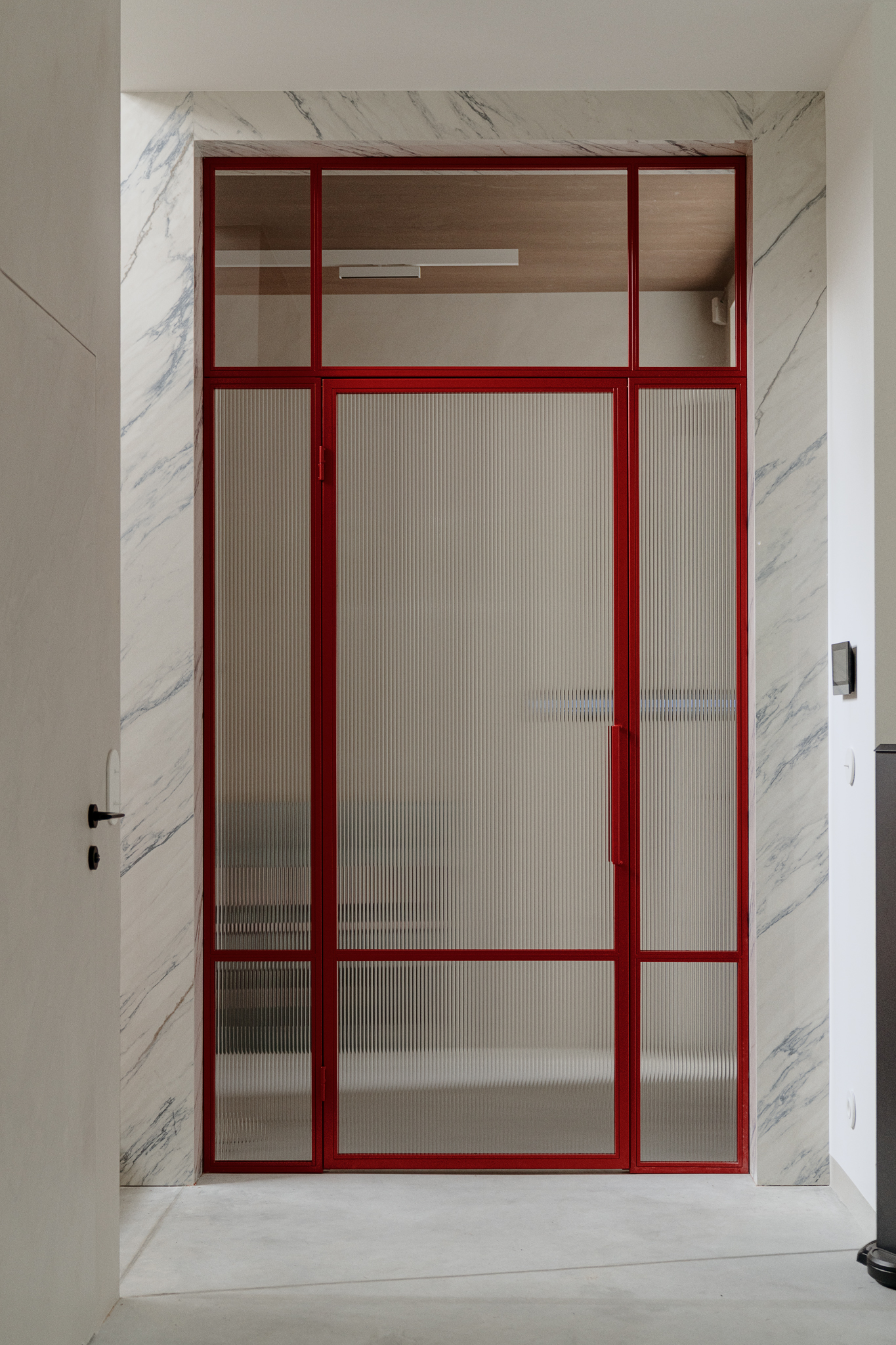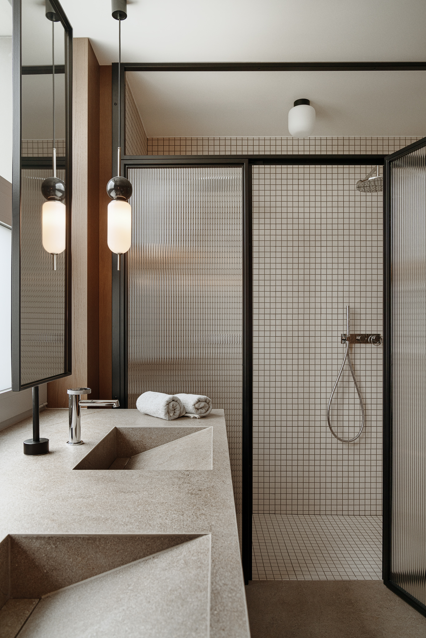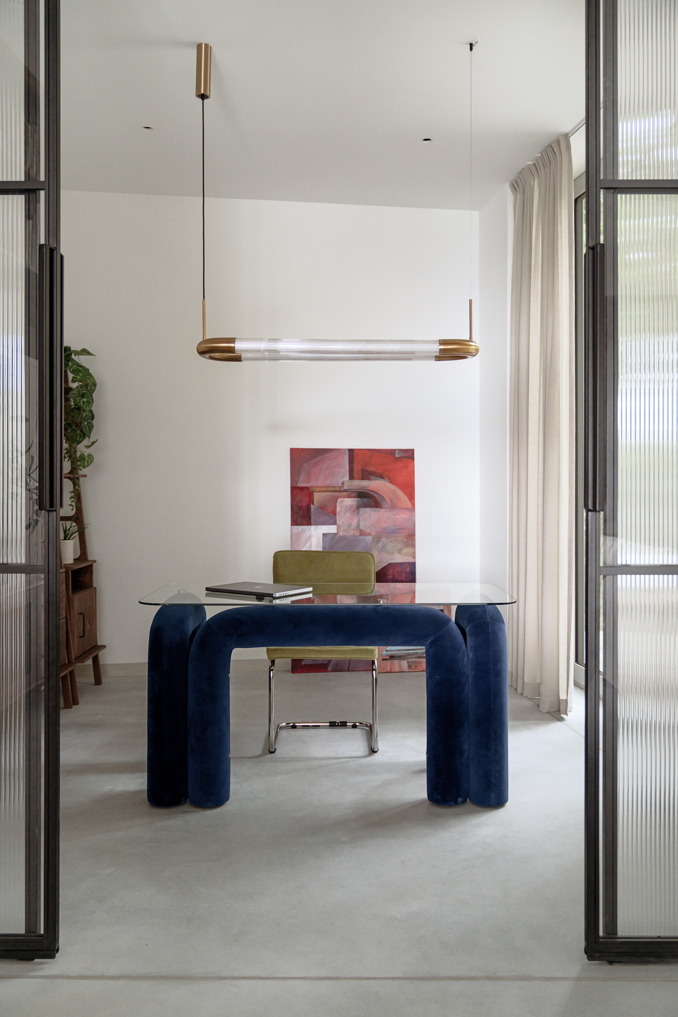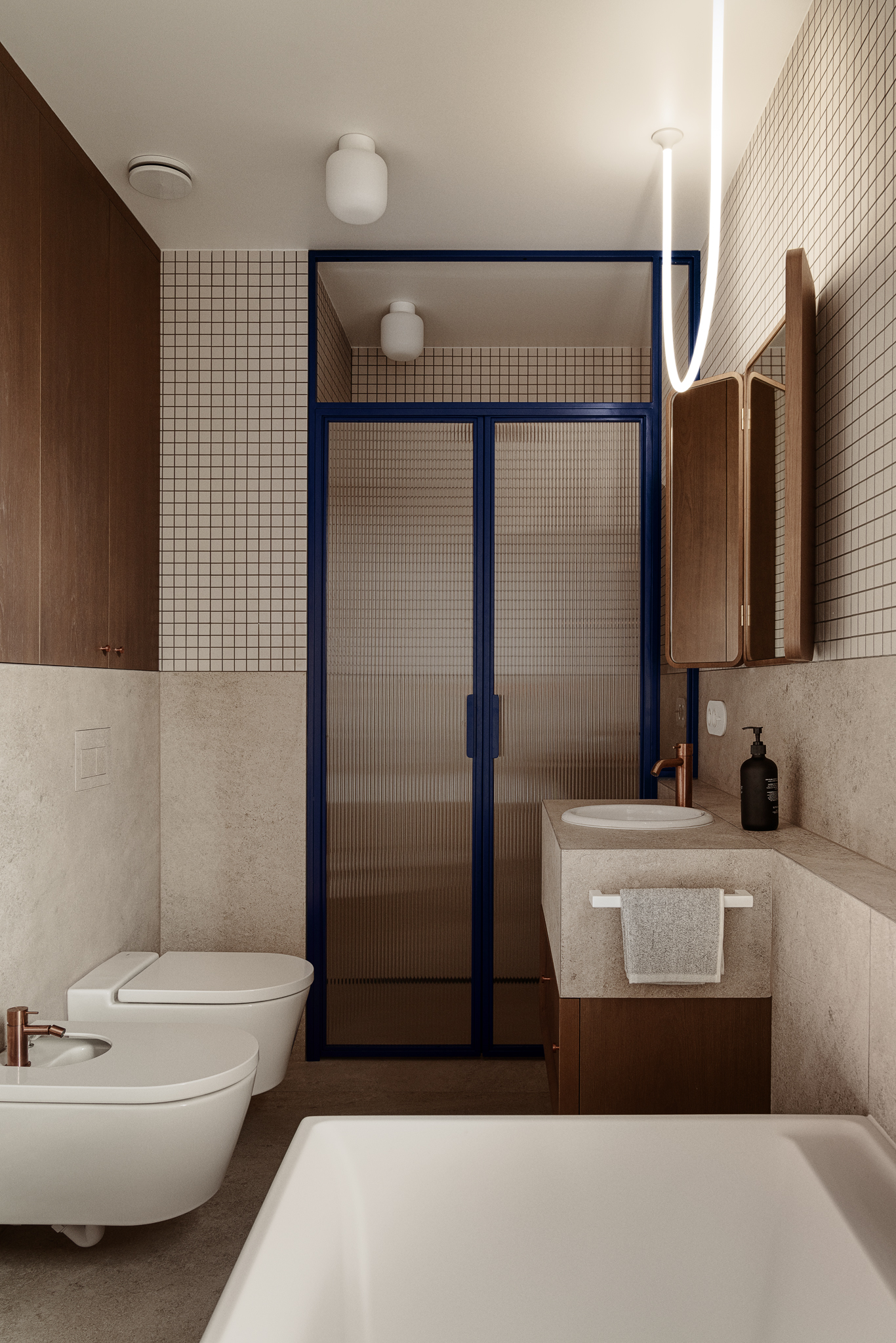 W projekcie dominują naturalne materiały: drewno, kamień i beton. Odważne akcenty kolorystyczne przełamują stonowaną paletę, nadając wnętrzu wyrazisty charakter.