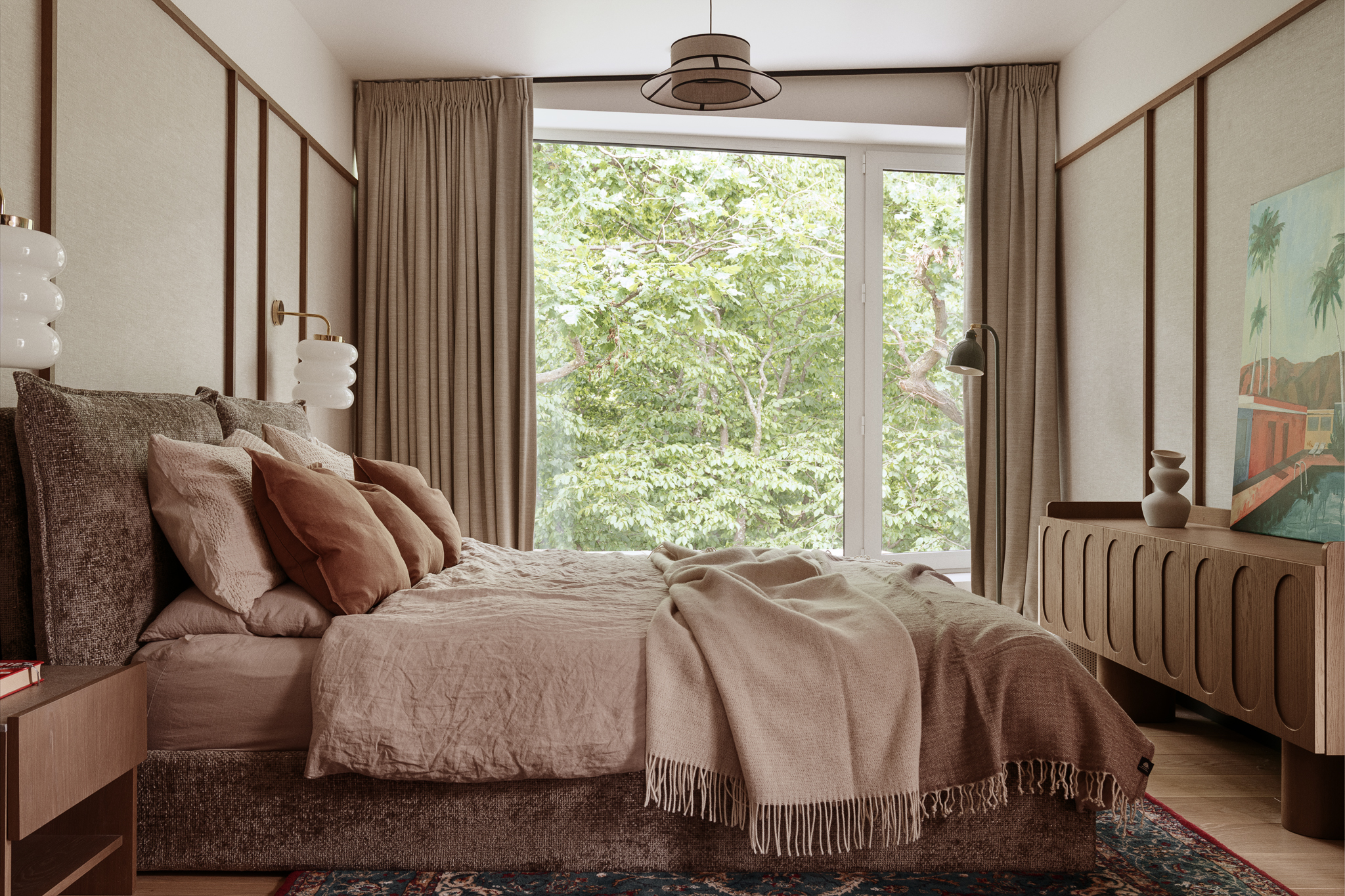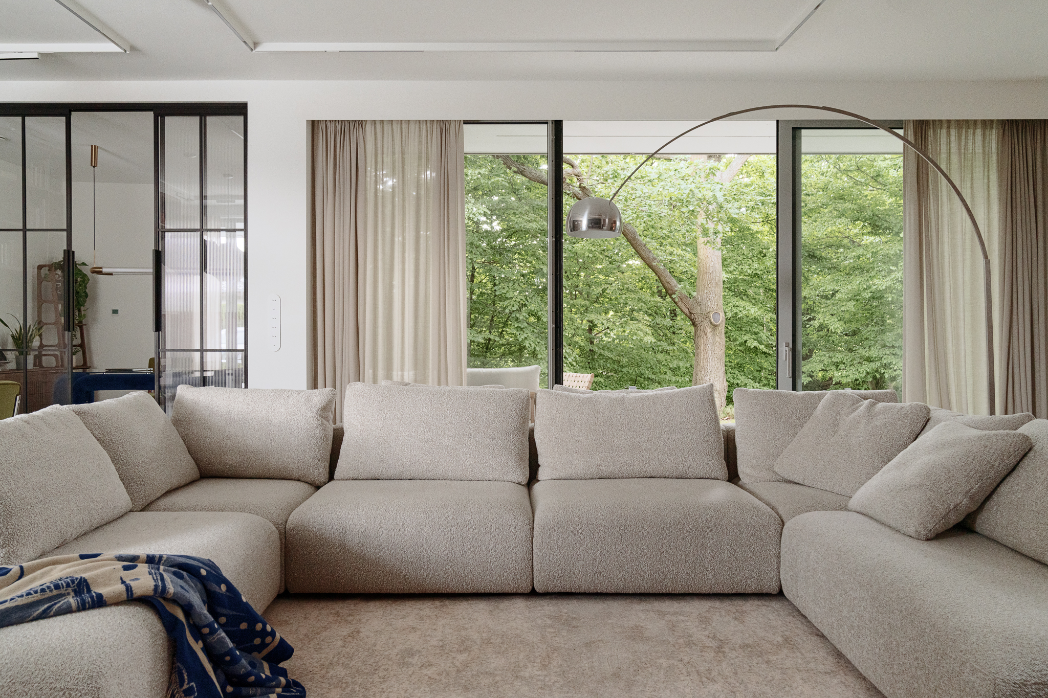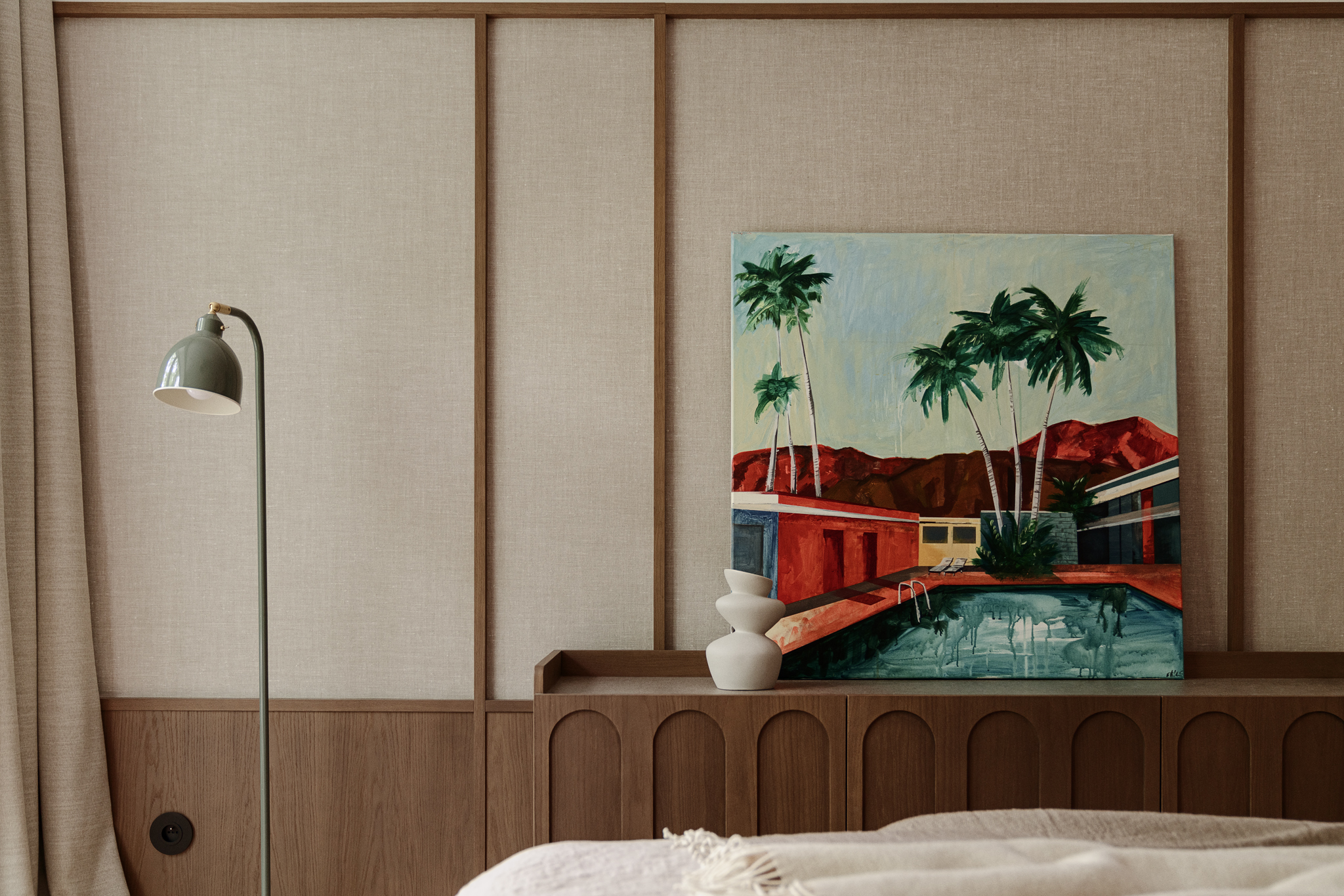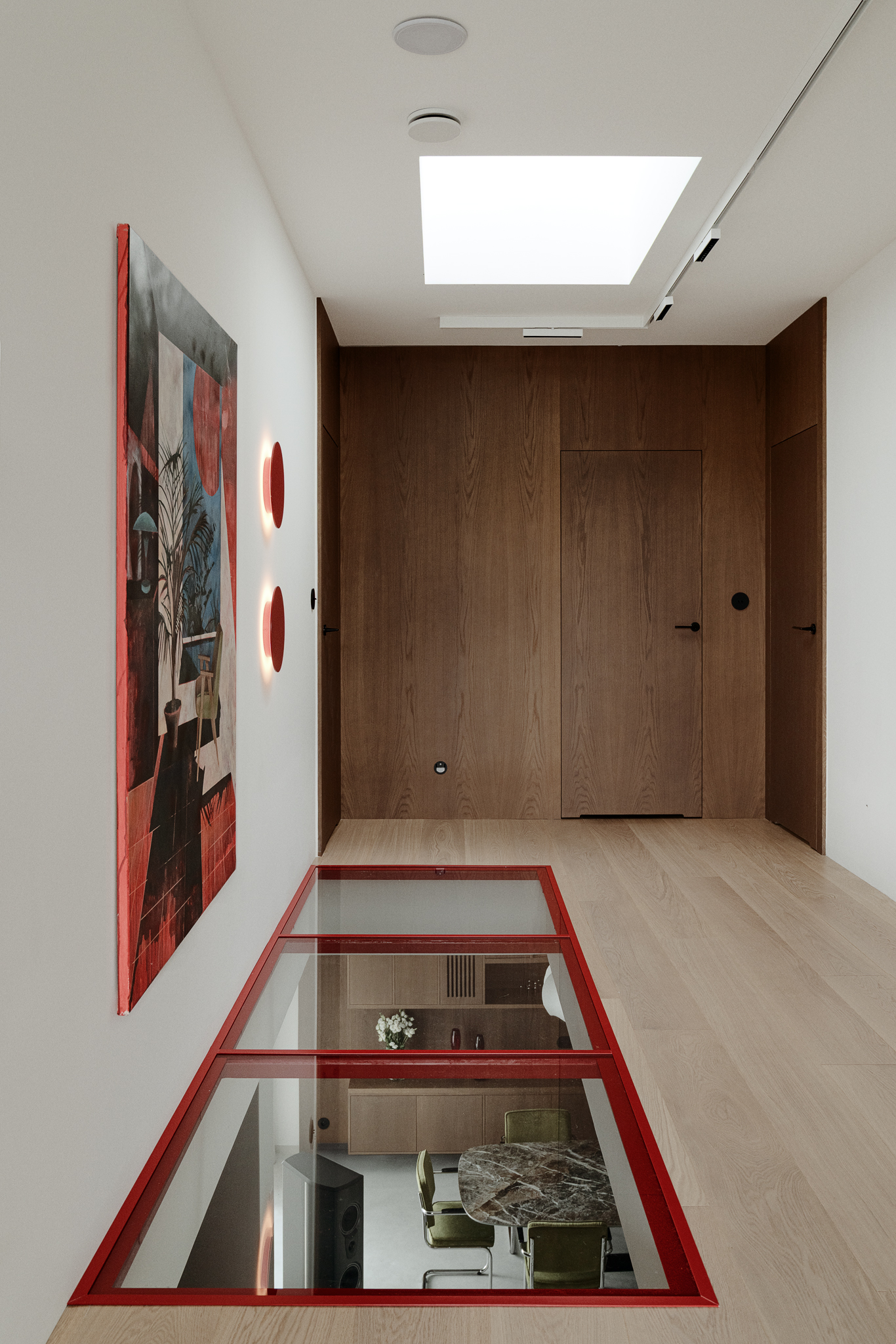 W projekcie dominują naturalne materiały: drewno, kamień i beton. Odważne akcenty kolorystyczne przełamują stonowaną paletę, nadając wnętrzu wyrazisty charakter.